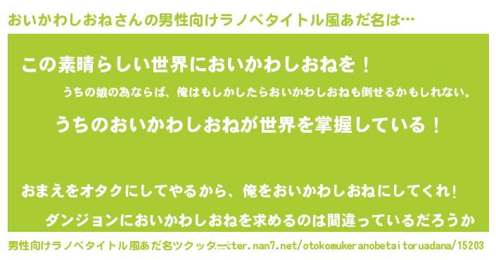| 胡散臭い通販商品みたいなあだ名 | 『あなたにだけ特別に提供する世界で10本だけ現存している希少なブランデー…その名も「おいかわしおね」』 |
