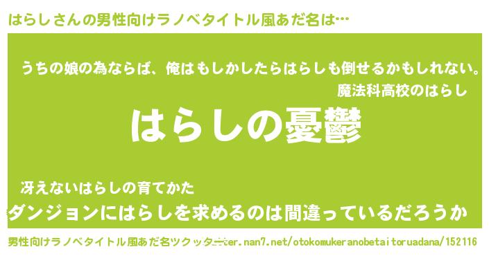 | 女子向けラノベタイトル風あだ名 | 『(仮)はらしのやんごとなき事情』 |