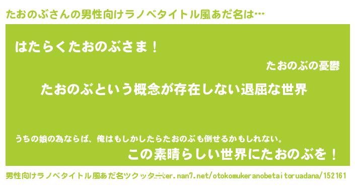 | 胡散臭い通販商品みたいなあだ名 | 『来世でも幸せになれる水素水…その名も「たおのぶ」』 |