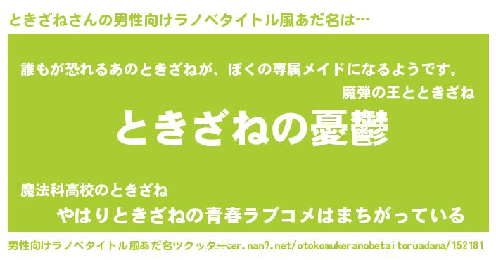 | 女子向けラノベタイトル風あだ名 | 『(仮)ときざねのやんごとなき事情』 |