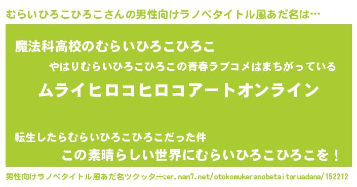 | 女子向けラノベタイトル風あだ名 | 『誰かこのむらいひろこひろこを説明してください! ~契約から始まるウェディング~』 |
