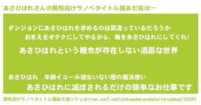 | 女子向けラノベタイトル風あだ名 | 『異世界で失敗しない100のあさひはれ』 |