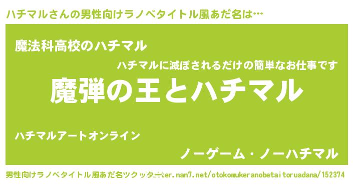 | 女子向けラノベタイトル風あだ名 | 『ハチマルが死なない童話 林檎のハチマルの診療簿』 |