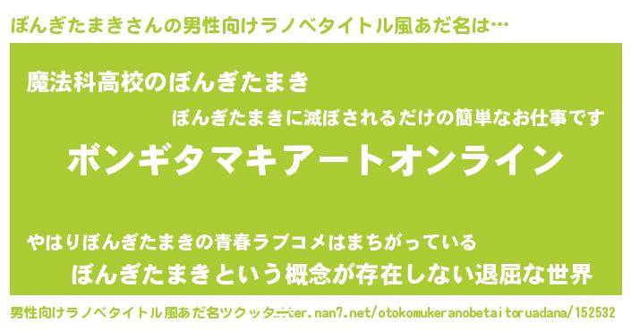 | 女子向けラノベタイトル風あだ名 | 『誰かこのぼんぎたまきを説明してください! ~契約から始まるウェディング~』 |