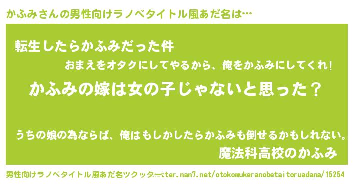 | 胡散臭い通販商品みたいなあだ名 | 『全米が絶賛したサプリメント…その名も「かふみ」』 |
