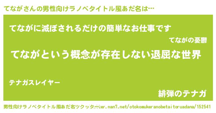 | 女子向けラノベタイトル風あだ名 | 『異世界で失敗しない100のてなが』 |