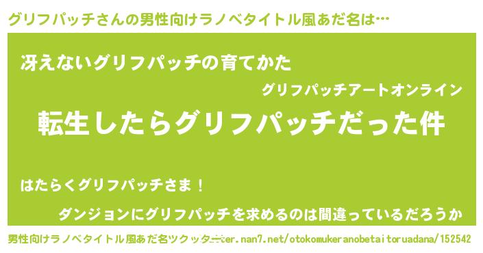 | 女子向けラノベタイトル風あだ名 | 『婚約破棄系悪役グリフパッチに転生したので、保身に走りました。』 |