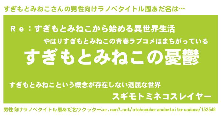 | 女子向けラノベタイトル風あだ名 | 『(仮)すぎもとみねこのやんごとなき事情』 |