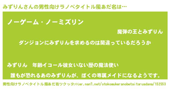 | 女子向けラノベタイトル風あだ名 | 『みずりんの卵を拾いまして』 |