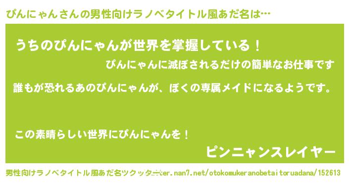 | 女子向けラノベタイトル風あだ名 | 『異世界でカフェぴんにゃんを開店しました。』 |