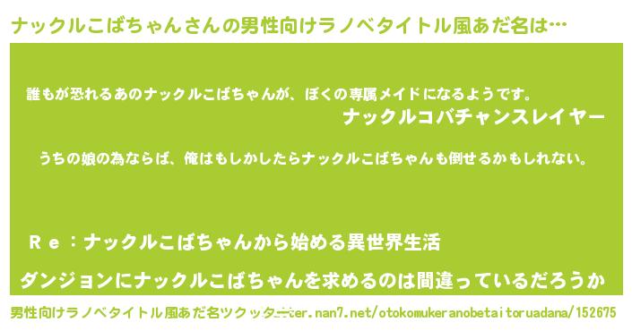 | 女子向けラノベタイトル風あだ名 | 『ナックルこばちゃん伯爵の花嫁』 |