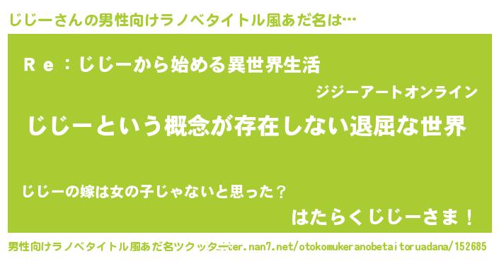 | 女子向けラノベタイトル風あだ名 | 『異世界で失敗しない100のじじー』 |