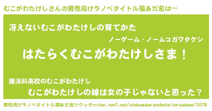| 意味不明あだ名 | 『とにかく怪しいむこがわたけし』 |