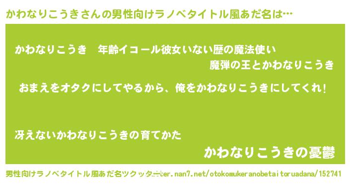| 女子向けラノベタイトル風あだ名 | 『かわなりこうき夫妻のなれそめ』 |