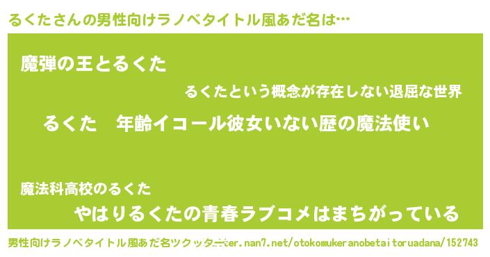 | 女子向けラノベタイトル風あだ名 | 『るくたの玉の輿計画!』 |