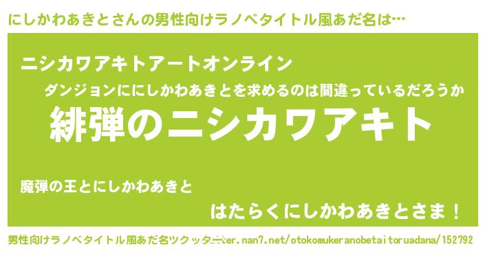 | 胡散臭い通販商品みたいなあだ名 | 『必ず成功するブレスレット…その名も「にしかわあきと」』 |
