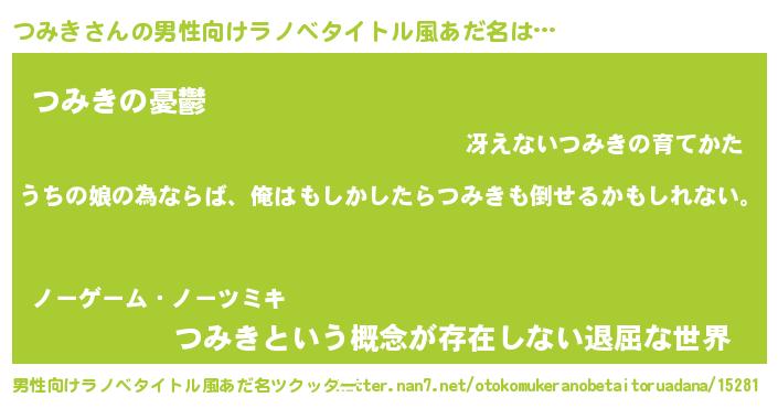 | 女子向けラノベタイトル風あだ名 | 『つみきの婚約者』『つみきの契約王妃』 |