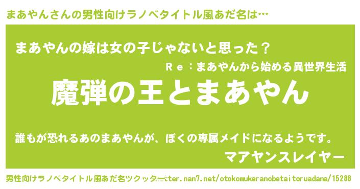| 女子向けラノベタイトル風あだ名 | 『乙女ゲームの破滅フラグしかない悪役まあやんに転生してしまった…』 |