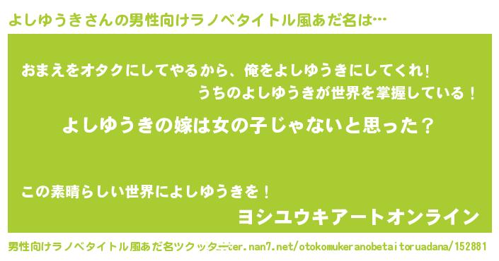 | 女子向けラノベタイトル風あだ名 | 『よしゆうき様がみてる』 |