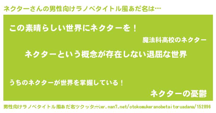 | 女子向けラノベタイトル風あだ名 | 『異世界で失敗しない100のネクター』 |