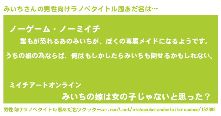 | 女子向けラノベタイトル風あだ名 | 『みいち伯爵の花嫁』『みいち恋絵巻』 |