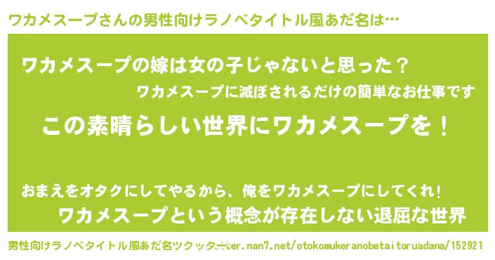 | 女子向けラノベタイトル風あだ名 | 『悪役ワカメスープに転生したようですが、知った事ではありません』 |
