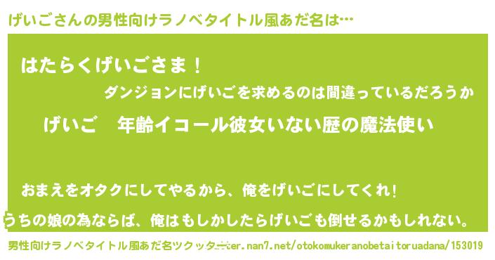 | 女子向けラノベタイトル風あだ名 | 『げいごの玉の輿計画!』『げいご恋絵巻』 |