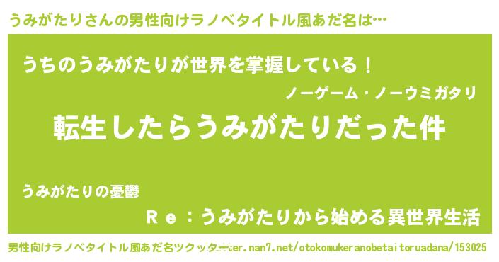 | 女子向けラノベタイトル風あだ名 | 『うみがたりの玉の輿計画!』 |