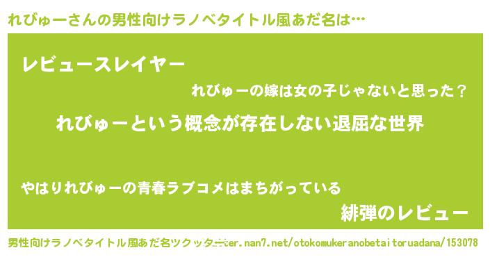| 女子向けラノベタイトル風あだ名 | 『異世界で失敗しない100のれびゅー』 |