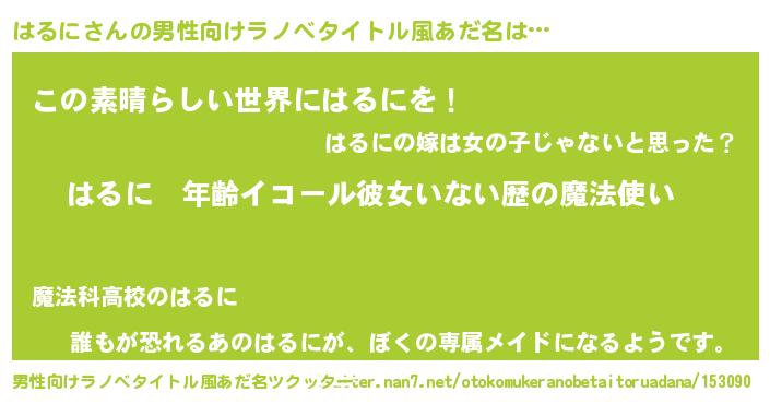 | 女子向けラノベタイトル風あだ名 | 『はるにの玉の輿計画!』 |