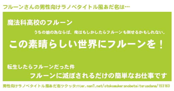 | 女子向けラノベタイトル風あだ名 | 『悪役フルーンに転生したようですが、知った事ではありません』 |