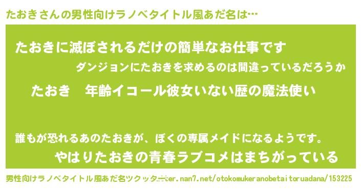 | 女子向けラノベタイトル風あだ名 | 『たおきの玉の輿計画!』 |