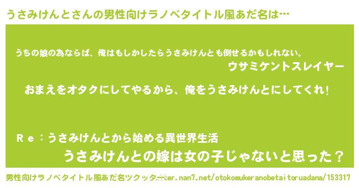 | 女子向けラノベタイトル風あだ名 | 『うさみけんと夫妻のなれそめ』 |