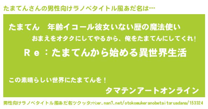 | 女子向けラノベタイトル風あだ名 | 『闇のたまてん』『たまてん恋絵巻』 |
