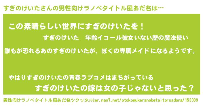 | 女子向けラノベタイトル風あだ名 | 『すぎのけいたの契約王妃』 |