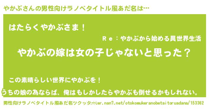 | 女子向けラノベタイトル風あだ名 | 『やかぶ様がみてる』『やかぶ伯爵の花嫁』 |