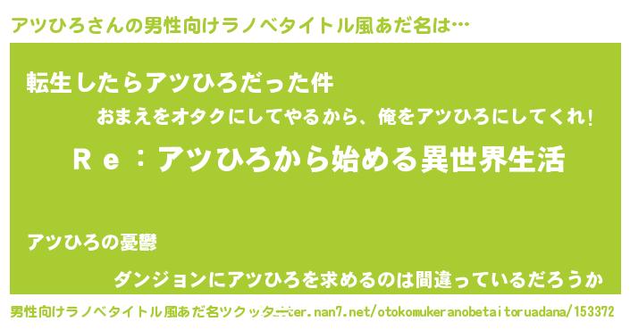 | 意味不明あだ名 | 『自称アツひろ』『なめこ科アツひろ属』 |