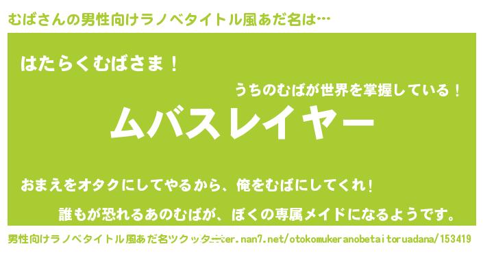 | 女子向けラノベタイトル風あだ名 | 『婚約破棄系悪役むばに転生したので、保身に走りました。』 |