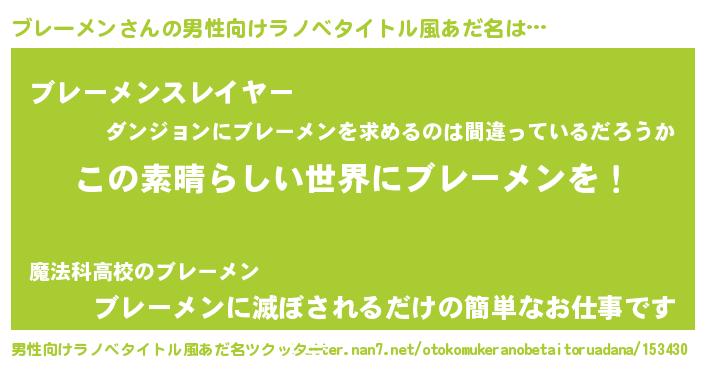 | 意味不明あだ名 | 『住所不定無職ブレーメン(8歳)』 |