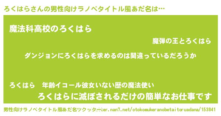 | 女子向けラノベタイトル風あだ名 | 『ろくはらの卵を拾いまして』 |