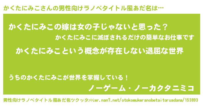| 女子向けラノベタイトル風あだ名 | 『異世界で失敗しない100のかくたにみこ』 |