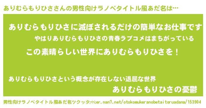 | 女子向けラノベタイトル風あだ名 | 『乙女ゲームの破滅フラグしかない悪役ありむらもりひさに転生してしまった…』 |