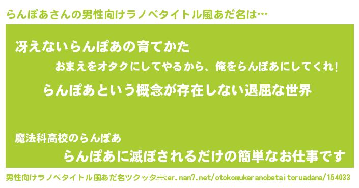 | 女子向けラノベタイトル風あだ名 | 『異世界で失敗しない100のらんぽあ』 |