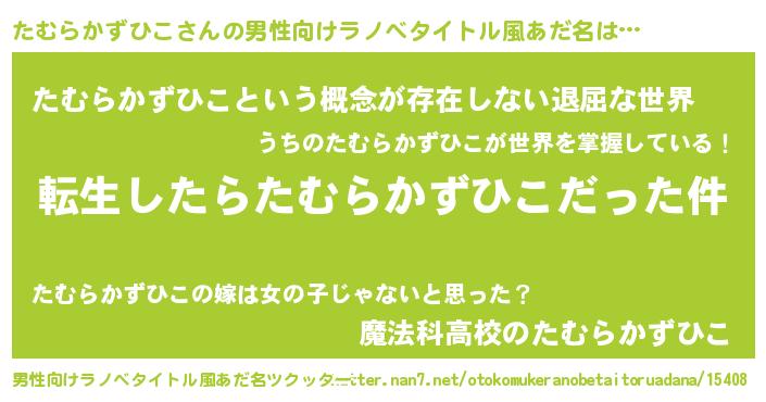 | 女子向けラノベタイトル風あだ名 | 『婚約破棄系悪役たむらかずひこに転生したので、保身に走りました。』 |