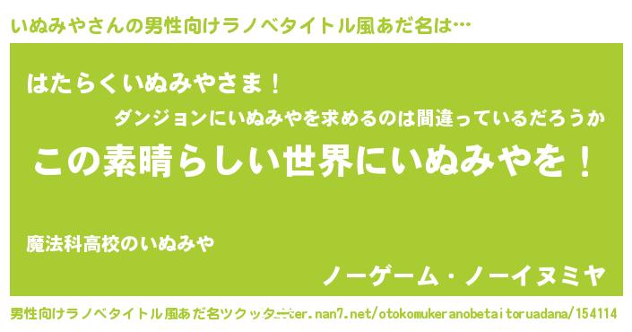 | 女子向けラノベタイトル風あだ名 | 『悪役いぬみやに転生したようですが、知った事ではありません』 |