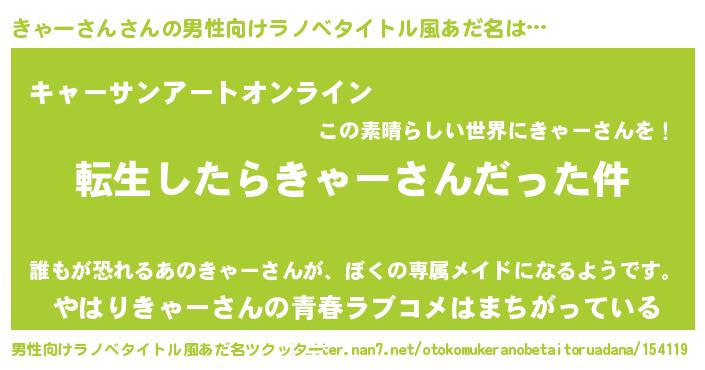 | 女子向けラノベタイトル風あだ名 | 『きゃーさんの玉の輿計画!』 |