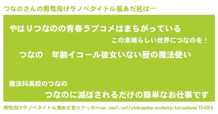 | 女子向けラノベタイトル風あだ名 | 『つなのの玉の輿計画!』 |