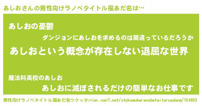 | 女子向けラノベタイトル風あだ名 | 『異世界で失敗しない100のあしお』 |