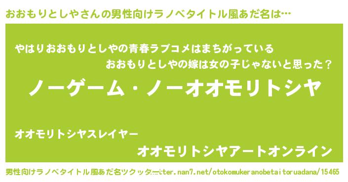 | 女子向けラノベタイトル風あだ名 | 『死神おおもりとしやの再婚』 |