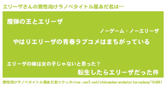 | 女子向けラノベタイトル風あだ名 | 『エリーザの雑貨屋さん』 |